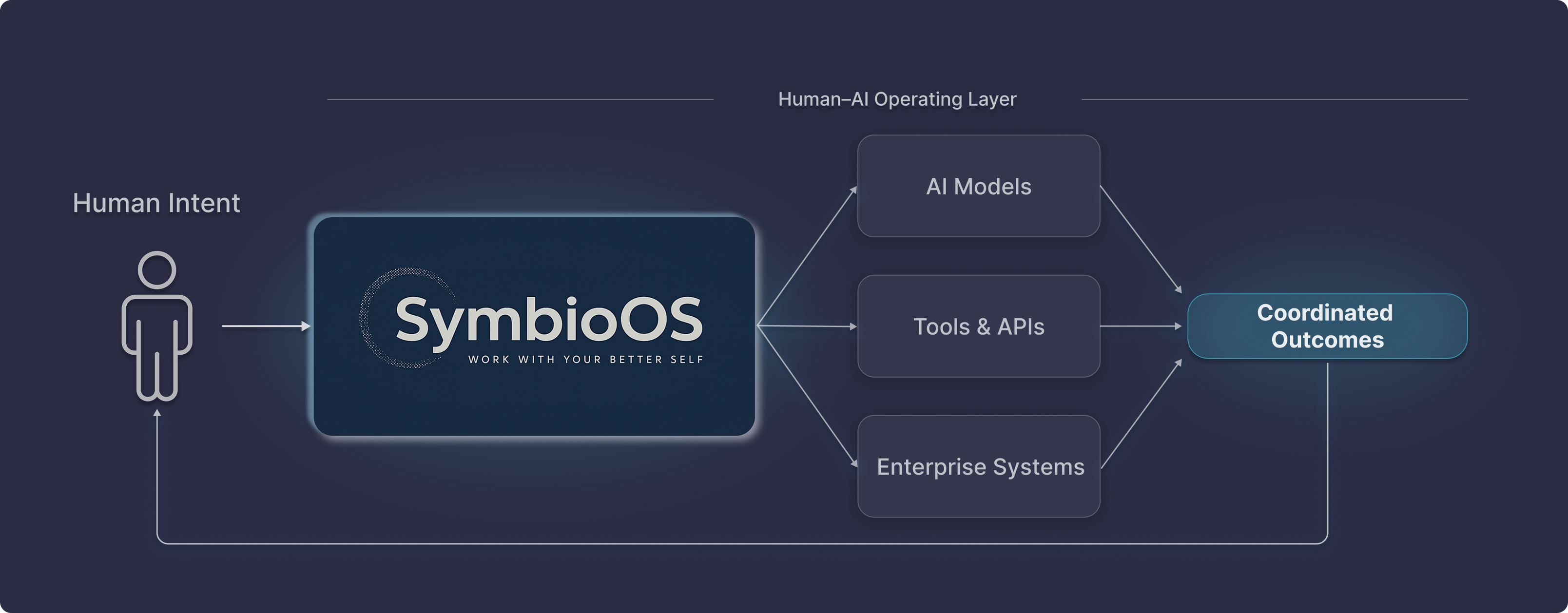 SymbioOS fits above existing tools, data, and AI models as a Human–AI Operating Layer.It does not replace models or systems. It provides the missing operating structure that aligns human intent, AI execution, and accountability across them.
